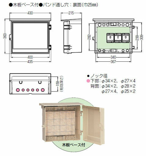 仕様プラスチック製防雨スイッチボックス色:ミルキーホワイト取付スペースELB:3P100AF×3ボックス外形寸法(mm)(屋根・突起部等含):・タテ:363・ヨコ:435・フカサ:215有効フカサ:159バンド通し穴:有取付スペースは参考容量ですので、機器寸法をご確認下さい。