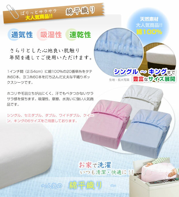 綿平織ボックスシーツ (3色で1組:セット販売) 商品説明 さらりとした肌触りがとっても心地よい、定番の平織りタイプ。
