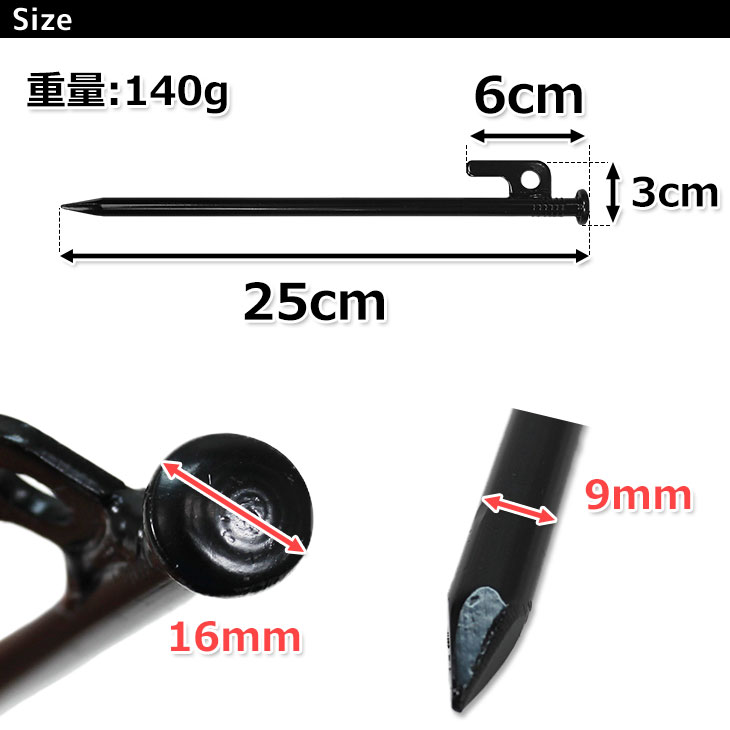 製品仕様 商品名 M-STYLE ペグ スチール ソリッド テント ステーク キャンプ 設営 25cmタイプ 12本セット サイズ (約)250mm (ヘッド部直径(約)16mm / 打ち込み部直径(約)9mm) / 重量:(約)140g/1本あたり カラー ブラック 素材/材質 スチール ; 表面処理:黒電着塗装 セット内容 12本セット 商品説明 キャンプでのテントやタープ、ポールの設置を行う際に適した強靭なペグです。
